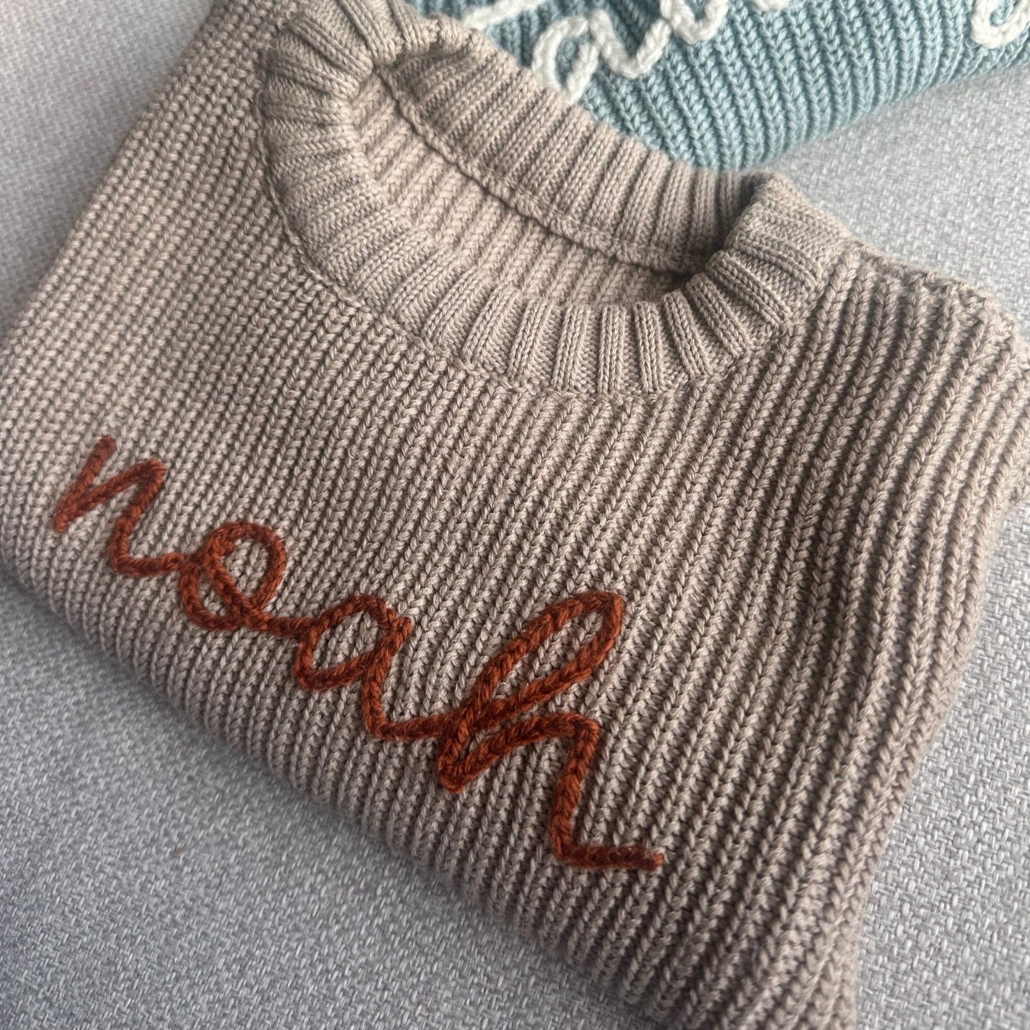 Capture your little ones first moments with our chunky knit personalized jumpers. Made from 100% cotton, they are the perfect keepsake for your newborns first photos, gifts and to capture those special moments. Each name is hand embroidered with love.